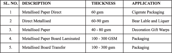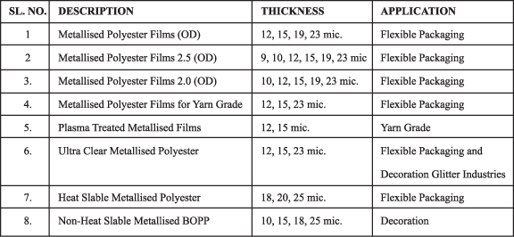 Metallize films can be produced from width starting 800mm – 1650mm, with optical densities from 0.5 to 3.5 as per the customer requirements.