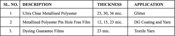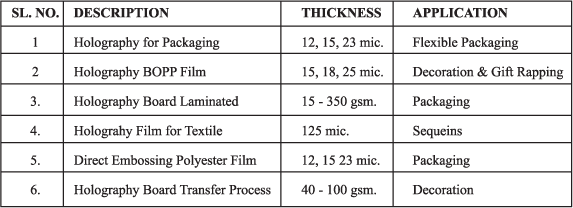 Apart from this, Sheetal is also introduced DIRECT HOLOGRAPHY CUM FLEXOMET (window metallize) FILMS for security of the product, which gives a new dimension in the market and which makes very difficult to copy the product.